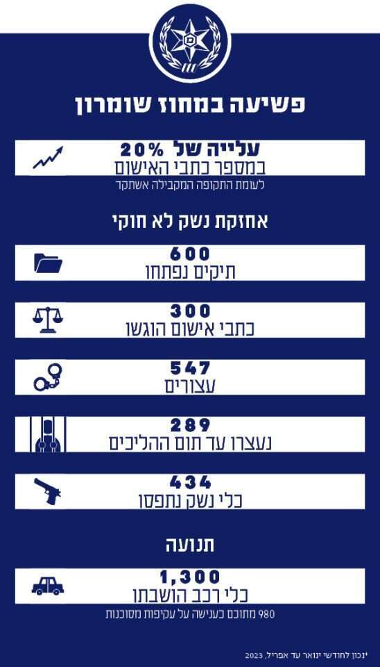 על פי הנתונים שמציג נצ"מ שימן, מאז ינואר 2023 ועד תחילת השבוע הנוכחי, נתפסו במחוז ש"י 434 כלי נשק; מלבדם אותרו והוחרמו פריטי אמל"ח נוספים. "מתחילת השנה נפתחו 600 תיקים בנושא עבירות אמל"ח של פלסטינים באזור יהודה ושומרון", הוא מפרט. "מתוך התיקים הללו הוגשו כ־300 כתבי אישום, כלומר חצי מהתיקים שנפתחו. כל יחידת חקירות בעולם הייתה מתהדרת בדבר הזה. זה נתון שאין לו אח ורע, והוא מצביע על מודיעין וחקירות אפקטיביים מאוד. בכלל התיקים הללו אנחנו מחזיקים נכון להיום 289 חשודים, שמצויים במעצר עד תום ההליכים".