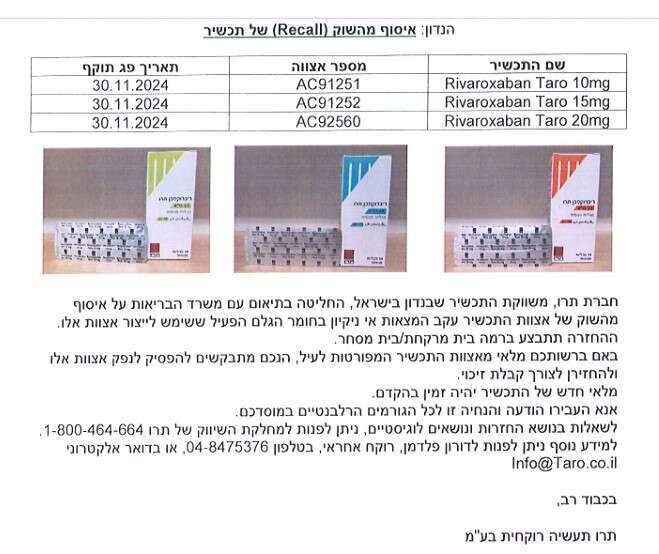 כמו כן, משרד הבריאות הודיעה היום על ריקול נוסף, הפעם של התרופה ריברוקסבן תרו Rivaroxaban taro)) המשווקת בישראל על ידי חברת תרו, ומונעת קרישה שיכולה לגרום להיווצרות של קרישי דם בכלי הדם ובלב. חברת תרו, משווקת התכשיר, החליטה בתיאום עם משרד הבריאות על איסוף מהשוק של מספר אצוות התכשיר עקב המצאות אי ניקיון בחומר הגלם הפעיל ששימש לייצור אצוות אלו.