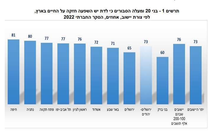 שיעור המסכימים מאוד בקרב היהודים בחלוקה לפי מגזרים: 36 אחוזים מהחרדים, 26 אחוזים מהדתיים, 24 אחוזים מהמסורתיים ו-43 אחוזים מהחילונים. שיעור הסבורים כך בערים עם יותר מ-200,000 תושבים נע בטווח שבין 81 אחוזים בחיפה לבין 60 אחוזים בבני ברק.