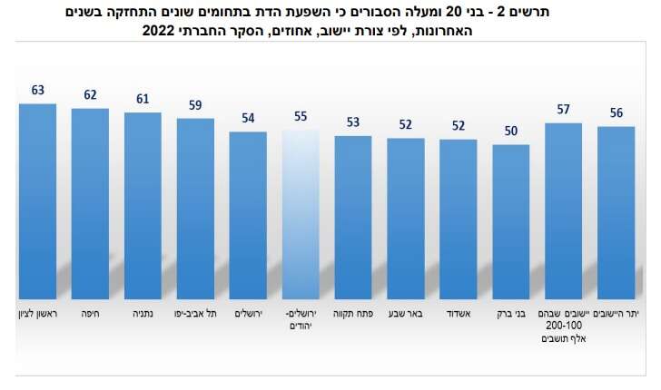 56 אחוזים מהנשאלים הסכימו עם האמרה לפיה "השפעת הדת בתחומים שונים התחזקה בשנים האחרונות". 37 אחוזים לא הסכימו לכך. 57 אחוזים מהיהודים ו-52 אחוזים מהערבים מסכימים מאוד או מסכימים. 47 אחוזים מהחרדים, 44 אחוזים מהדתיים, 54 אחוזים מהמסורתיים ו-67 אחוזים מהחילונים 'מסכימים מאוד' או 'מסכימים' כי השפעת הדת התחזקה. שיעור הסבורים כך בערים הגדולות נע בטווח שבין 63 אחוזים בראשון לציון לבין 50 אחוזים בבני ברק.
