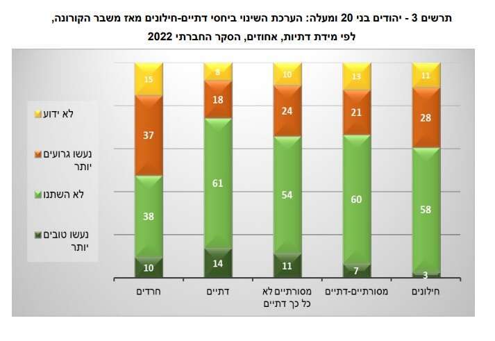 לגבי שאלת יחסי דתיים וחילונים מאז משבר הקורונה, בקרב יהודים, 6.7 אחוזים סבורים כי מאז משבר הקורונה היחסים השתפרו, 56 אחוזים סבורים כי הם לא השתנו, 26 אחוזים סבורים כי היחסים נעשו גרועים יותר. 10 אחוזים מהחרדים סבורים כי היחסים נעשו טובים יותר, לעומת 2.8 אחוזים מהחילונים. בערים הגדולות שיעור הסבורים כי היחסים השתפרו נמוך יחסית ובמגבלת גודל המדגם הוא אינו ניתן לפרסום. יותר משליש מתושבי אשדוד (37 אחוזים) ובני ברק (39 אחוזים) סבורים כי היחסים נעשו גרועים יותר. 37 אחוזים מהחרדים סבורים שהיחסים נעשו גרועים יותר לעומת 18 אחוזים מהדתיים, 22 אחוזים מהמסורתיים ו-28 אחוזים מהחילונים.
