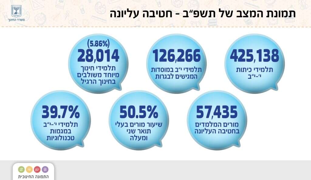 באשר לתקציבים המושקעים בתלמיד, מנתוני משרד החינוך עולה כי בחינוך הערבי חל הגידול הגבוה ביותר בתקציב הממוצע לתלמיד: 20,102 שקל בשנת תשפ"ב, מדובר בגידול של 46 אחוזים בתקציב לתלמיד תוך עשור. בחינוך היהודי הרשמי חל גידול בשיעור של 35 אחוזים, כך שתקציבו עומד על 18,400 שקלים בשנת 2022.