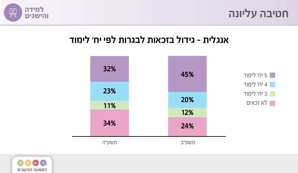 מספר התלמידים שעשו חמש יחידות מתמטיקה עומד על 17.3 אחוזים בשנת הלימודים האחרונה, 21,173 תלמידים. במקצוע האנגלית, ברמה של 5 יחידות, ישנה עלייה מ-42.9 אחוזים בשנת הלימודים תשפ"א ל-44.6 אחוזים בשנת הלימודים תשפ"ב, סך הכול 54,504 תלמידים.