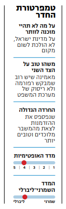 "אנחנו יוצרים פה אויבים מיתיים ושונאים אותם בעוצמה – ימין כלפי שמאל כלפי ימין – כשבפועל ההבדלים לא כאלה גדולים. ואם היינו מוצאים את עצמנו בתוך אותה ממשלה, הזעם והשנאה היו מתפרקים. איך אני יודעת? כי חמש דקות אחרי שבנט אמר 'אני לא יושב עם תומך הטרור הזה', הוא שיתף פעולה עם עבאס והודה שזה לא מה שהוא חשב. ראיתי בטלוויזיה את שקד מסתודדת עם תמר זנדברג במליאה, ומיד צילמתי את המסך בהתרגשות. הנה הן יושבות ומסתודדות יחד, והשמיים לא נפלו".