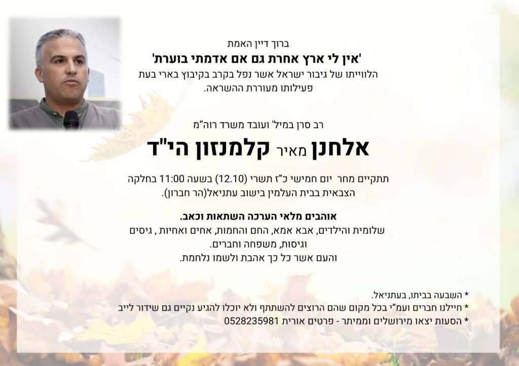 הלוויית אלחנן קלמנזון הי"ד בישיבת עתניאל: