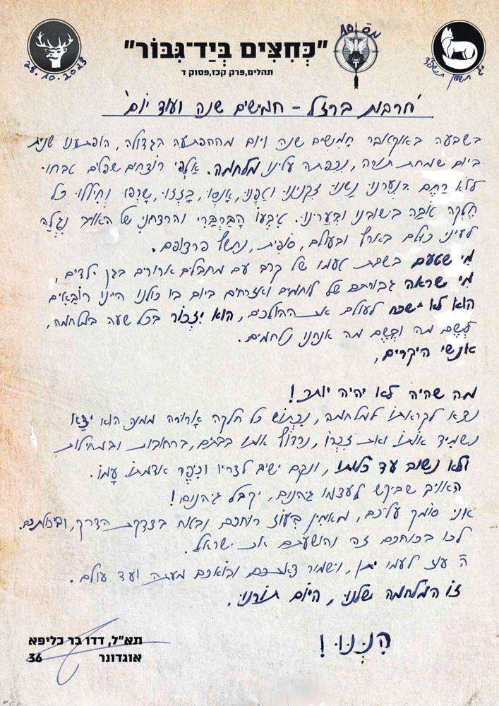 ברקע פתיחת השבוע הרביעי ללחימה, הבוקר (א') התפרסמה איגרת של מפקד עוצבת געש תא"ל דוד בר כליפא, המיועדת ללוחמים. את האיגרת, אשר נכתבה בכתב ידו, הוא פותח במילים הבאות: