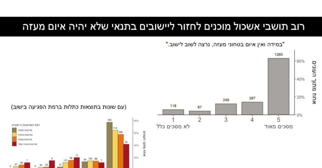 60 אחוז ענו כי הם מסכימים מאד עם האמירה כי "אם אין איום ביטחוני מעזה, נרצה לשוב ליישוב". כלומר, רוב תושבי אשכול מוכנים לחזור ליישובים בתנאי שלא יהיה איום מעזה.