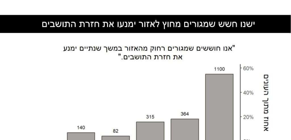 באשר לאפשרות של חזרה ליישובים עולה מהסקר כי ישנו חשש שמגורים מחוץ לאזור ימנעו את חזרת התושבים. 1,464 השיבו כי הם מסכימים ומסכימים מאוד עם האמירה לפיה "אנו חוששים שמגורים רחוק מהאזור במשך שנתיים ימנעו את חזרת התושבים". מנגד, 140 איש הצביעו כי הם לא מסכימים כלל.