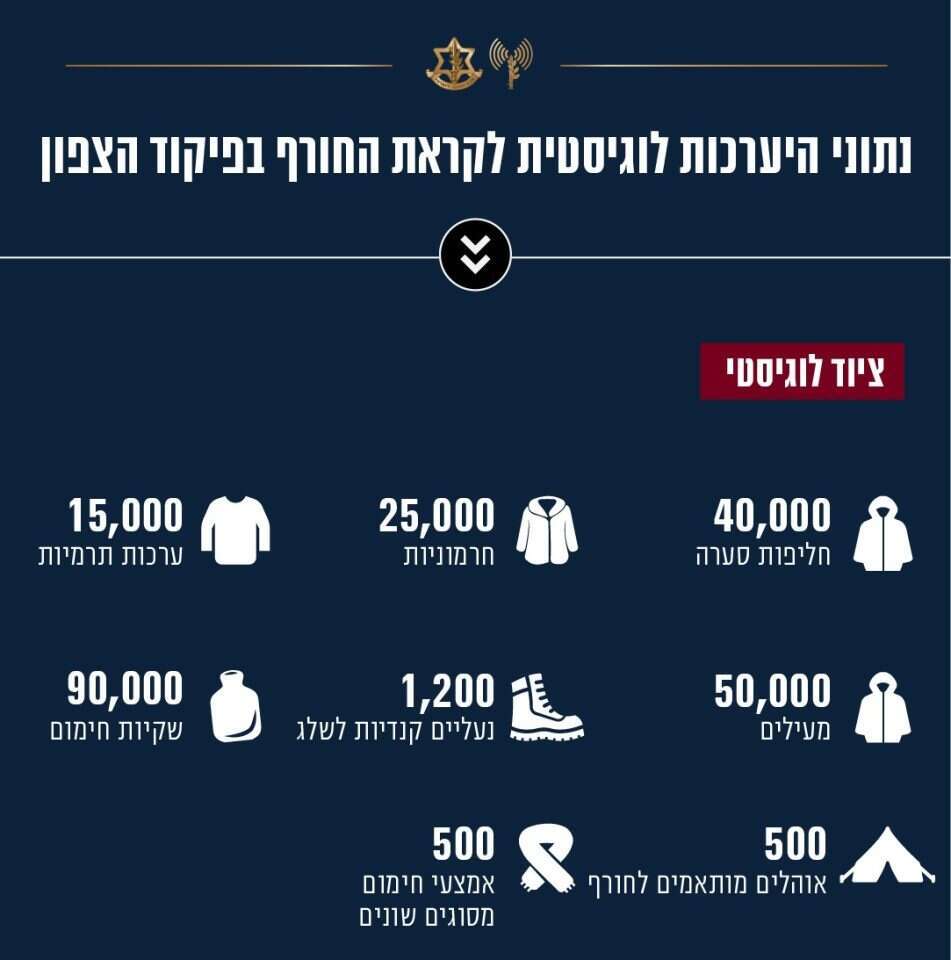 בצה"ל השלימו את ההיערכות הלוגיסטית לקראת החורף, בצל המלחמה, ובמסגרתה נופקו בשלושת השבועות האחרונים אלפי פריטים וציוד אישי ליחידות השוהות במרחב הצפון, מראש הנקרה ועד החרמון, סדיר ומילואים כאחד, תוך מיסוד המענה הלוגיסטי בדגש על מוכנות לשהייה ממושכת של הכוחות בשטח. בין הפריטים שנופקו - חלפ״סים (חליפות סערה), חרמוניות, סופטשלים, פליזים, מעילים, ציוד תרמי ועוד.
