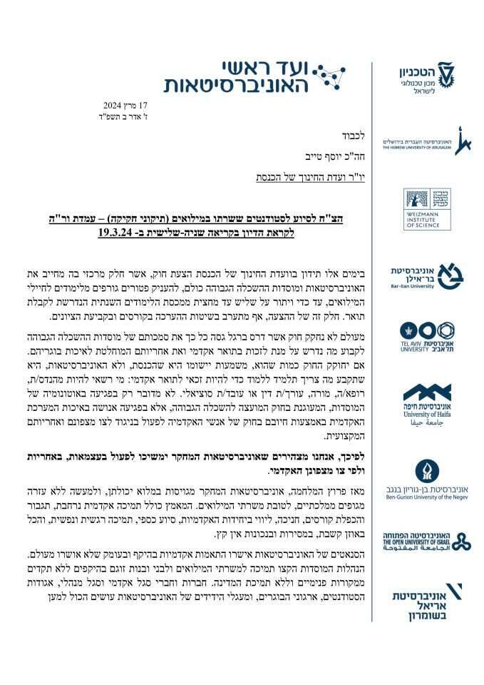 במכתב חריג שנשלח הבוקר (א') ליו"ר ועדת החינוך של הכנסת יוסף טייב, אומרים ראשי האוניברסיטאות בישראל כי הם מתנגדים לכך שהוועדה תדון ביום שלישי הקרוב בהצעת החוק לפיה המוסדות האקדמיים יחויבו להעניק פטורים לחיילי מילואים, כשלדבריהם יש בכך התערבות בשיטות הערכה בקורסים ובקביעת הציונים.