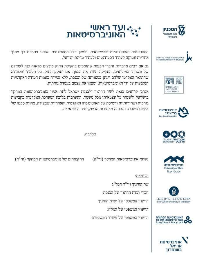 לבסוף ציינו כי "אנחנו קוראים בזאת לשר החינוך ולכנסת ישראל לתת אמון באוניברסיטאות המחקר בישראל ולשמור על עצמאותן מכל משמר. התערבות בליבת המערכת האקדמית בקביעות גורפות ושרירותיות ורמיסה של האוטונומיה האקדמית והאחריות שבצידה, מהוות סכנה של ממש להשכלה הגבוהה וליסודות הדמוקרטיה הישראלית".