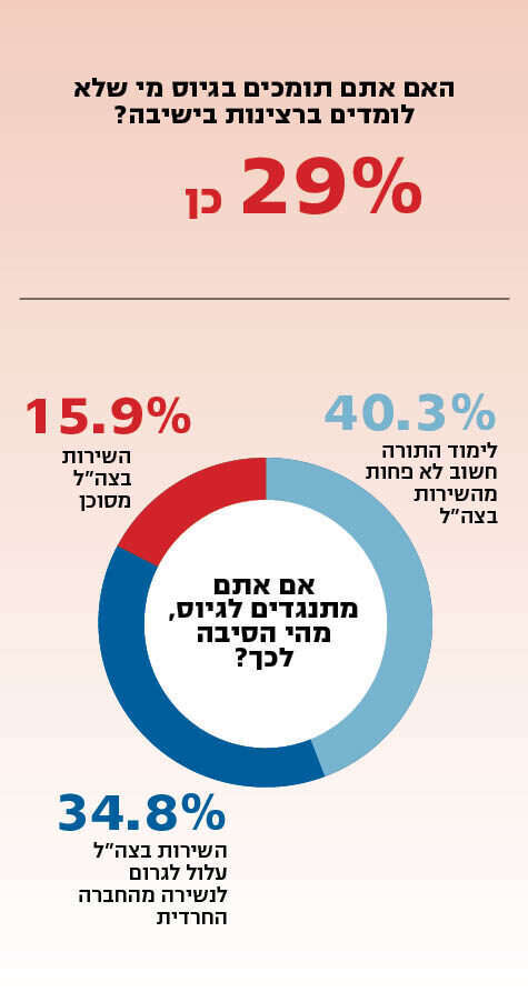 לפני שבועיים פרסם בג"ץ צו ביניים המקפיא את התמיכה לתלמידי ישיבות החייבים בגיוס מאז 1 באפריל. 83 אחוזים מנשאלי הסקר הביעו התנגדות בעקבות הצו לאפשרות שיוטלו עיצומים כלכליים על שמי שלא התגייסו, וכי לא יוכלו לקבל הטבות מהמדינה בתחומי הקצבאות, ההנחות בארנונה ושירותים נוספים.