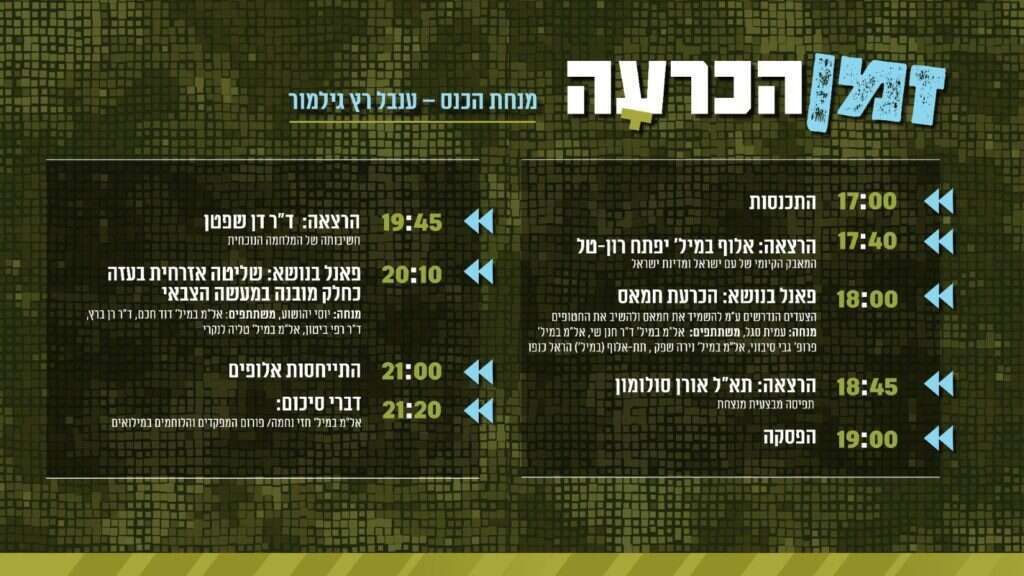 פורום מפקדים ולוחמים במילואים מקיים הערב כנס מיוחד שכותרתו "זמן הכרעה", לכנס יגיעו 4 אלופים במילואים, תתי אלופים במילואים ובקבע וביניהם האלוף יפתח רון-טל, אל"מ במיל' ד"ר חנן שי, אל"מ במיל' גבי סיבוני, אל"מ נירה שפק, אל״מ טליה לנקרי, אל"מ במיל' חזי נחמה ממובילי הפורום ותא"ל עופר וינטר אשר היה אמור לנאום בכנס, אך צה"ל אסר עליו. בנוסף ישתתפו 165 סגני אלופים ומאות קצינים בדרגות שונות ומרקעים שונים, רבים מהם חזרו מלחימה בעזה במלחמת חרבות ברזל.