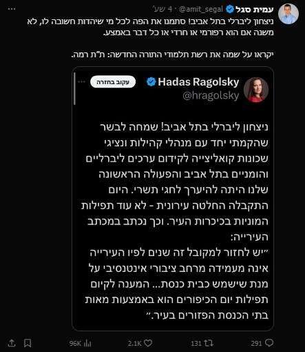 תגובת עיריית תל אביב- יפו למקור ראשון: "בתל אביב- יפו מותר להתפלל בכל מקום וכל אחד ואחת יכול/ה להתפלל איפה שרוצה, כאשר העירייה מקדשת את הזכות הזאת. כל אמירה אחרת כאילו העירייה אוסרת באופן גורף קיום תפילה במרחב הציבורי היא ספין שקרי שנועד לשסות וללבות. בקשות פרטניות של ארגונים לגבי מיקומים ספציפיים, כדוגמת כיכר דיזנגוף שבימים האלה קיים בה מיצג למען החטופים, העירייה בוחנת באופן פרטני בהתאם לנסיבות העניין".