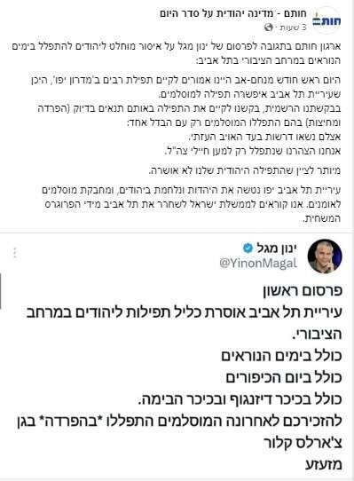 "היום ראש חודש מנחם אב, היינו אמורים לקיים תפילת רבים ב'מדרון יפו' היכן שעיריית תל אביב אפשרה תפילה למוסלמים. בבקשתנו הרשמית, ביקשנו לקיים את התפילה באותם תנאים בדיוק (הפרדה ומחיצות) בהם התפללו המוסלמים רק עם הבדל אחד: אצלם נשאו דרשות בעד האויב העזתי. אנחנו הצהרנו שנתפלל רק למען חיילי צה"ל. מיותר לציין שהתפילה היהודית שלנו לא אושרה. עיריית תל אביב נטשה את היהדות ונלחמת ביהודים".