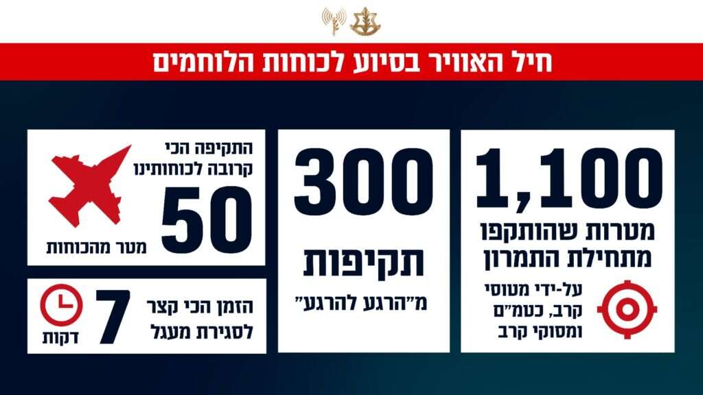 מתחילת הפעולה הקרקעית בדרום לבנון לפני 10 ימים, שאותה מקפידים לכנות בצה"ל "ממוקדת", תקפו מטוסי קרב, מסוקי קרב וכלי טיס מאוישים מרחוק מעל ל-1,100 תקיפות אוויריות בדרום לבנון ובהן מחסני אמל״ח, משגרים, פירי מנהרות ועמדות תצפית וצליפה. תקיפות אלו היו חלק ממטס הכנה לפעולה הקרקעית, בנוסף לכ-300 סגירות מעגל מהאוויר שהכווינו הכוחות הפועלים בשטח.