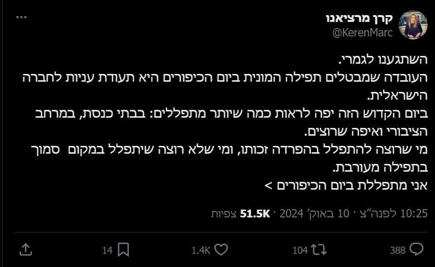 קרן מרציאנו, מגישת חדשות 12, כתבה בחשבון ה-X שלה: "השתגענו לגמרי. העובדה שמבטלים תפילה המונית ביום הכיפורים היא תעודת עניות לחברה הישראלית. ביום הקדוש הזה יפה לראות כמה שיותר מתפללים: בבתי הכנסת, במרחב הציבורי ואיפה שרוצים. מי שרוצה להתפלל בהפרדה זכותו, ומי שלא רוצה שיתפלל במקום סמוך בתפילה מעורבת...אני מתפללת בעזרת נשים ולא חשה מושפלת או מודרת. מכבדת את המסורת. וטוב לי עם זה. די עם הטרלול".