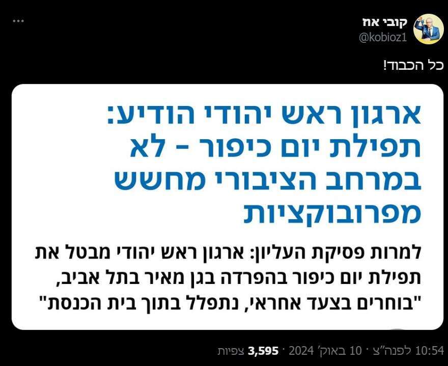 "ראש יהודי אתם לא "הנעלבים ואינם עולבים", אין בכם שמץ מהתמימות הזו", הוסיפה הפעילה החברתית החרדית ציפי לביא. "אתם פותחי המריבה, אתם אלו שהפכתם את היום הקדוש המוסכם האחד בשנה ליום של מלחמה, אתם אלו שלקחתם יום של תפילה והפכתם אותו ליום של פילוג, וחזרתם על הבקשה לעשות זאת גם השנה. כל גרם פילוג שנשפך על ראשנו לפני אחרי וביום כיפור תשפ"ד, וכל הפילוג שנגרם כתוצאה מהדרישה והעתירה שלכם השנה, בתשפ"ה, הוא עליכם. כל דתי שהרגיש כאב וחוסר שייכות בגלל זה, כל חילונית שהרגישה שדורכים לה במקום האחרון שעוד מרגיש לה כמו בית, כל ישראלי שעברה לו במוח המחשבה "אין תקווה למקום הזה. אולי אעשה רילוקיישן?" כל אלו זה בגללכם. אתם לא הקרבן המסכן פה. חצופים. תפסיקו לעשות גזלייטינג".