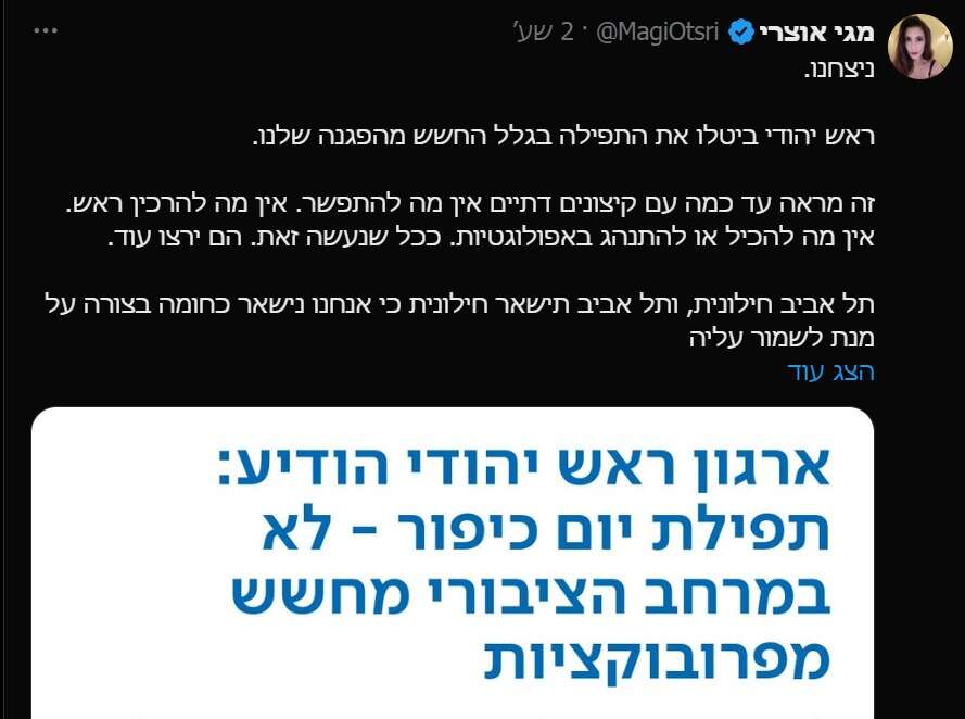 "ניצחנו", כתבה הפעילה והפובליצסטית מגי אוצרי, שרק אתמול איימה בתגובה לפסיקת בית המשפט שתגיע עם פעילים נוספים להפריע לתפילה, "ראש יהודי ביטלו את התפילה בגלל החשש מהפגנה שלנו. זה מראה עד כמה עם קיצונים דתיים אין מה להתפשר. אין מה להרכין ראש. אין מה להכיל או להתנהג באפולוגטיות. ככל שנעשה זאת. הם ירצו עוד. תל אביב חילונית, ותל אביב תישאר חילונית כי אנחנו נישאר כחומה בצורה על מנת לשמור עליה כזו".