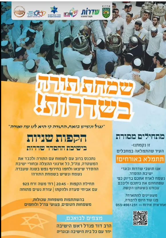 שנה אחרי שמתקפת הטרור האכזרית הכתה בעיר שדרות, שסבלה לאחר מכן ממטחים בלתי פוסקים, ישיבת ההסדר שדרות לא מוותרת על המסורת הידועה של הקפות שניות מלאות בשמחה ועוז. השנה, כחלק מציון שנה לטבח שמחת תורה, יכבדו את ההקפות השניות במעמדם שרים וחברי כנסת רבים, תושבי קיבוצי העוטף וגם אנשי כוחות הביטחון וההצלה. את ההקפות יובילו אביחי סעדה ולהקתו, במקום עזרת נשים פתוחה. הישיבה קוראת לעם ישראל לבוא בהמוניו ולהראות לארגוני הטרור שניסיונם לא צלח, והעיר שהתמלאה במחבלים תתמלא השנה באורחים.