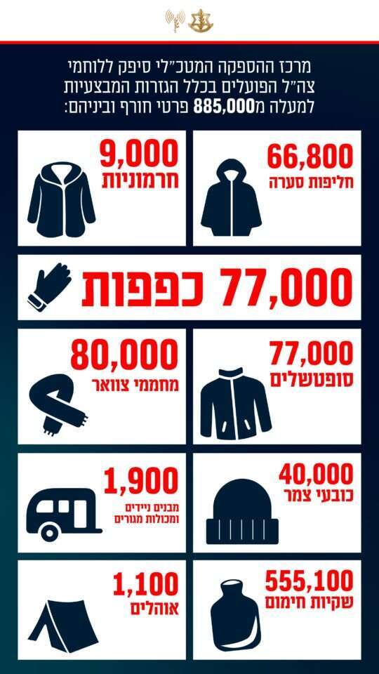 מרכז ההספקה המטכ”לי סיפק לכלל החיילים בסדיר ובמילואים למעלה מ-885 אלף פריטי ציוד חורף, בהם שק”שים מותאמים, 9,000 חרמוניות, יותר מ-66 אלף חליפות סערה, 38 וחצי אלף זוגות כפפות, 77 אלף סופטשלים, 80 אלף מחממי צוואר, 40 אלף כובעי צמר, ביגוד ייעודי לשלג ונגד קור, בנוסף למלאי הקיים ביחידות אשר חולק לאורך כל שנת הלחימה האחרונה. בתחום המזון סופקו ללוחמים ערכות בישול מחלקתיות, מנות לחימום ומגוון מנות מהירות להכנה המותאמות לאקלים החורפי. הלוחמים בשטח מקבלים מידי יום מזון חם וטרי שמגיע ישירות לשטחי הלחימה. בנוסף נופקו יותר מחצי מיליון שקיות חימום 1,100 אוהלים ו-1,900 מבנים ניידים ומכולות מגורים.