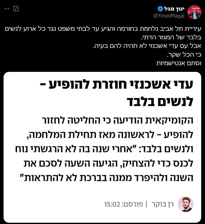 "עיריית תל אביב נלחמת בחורמה והגיע עד לבתי משפט נגד כל ארוע לנשים בלבד של המגזר הדתי", כתב מגל ברשתות החברתיות שלו, "אבל עם עדי אשכנזי לא תהיה להם בעיה. כי הכל שקר. וסתם אנטישמיות". כזכור בספטמבר השנה, הזמרות החרדיות דין דין אביב ושרון רוטר נתקלו בהתנגדות עזה מצד עיריית תל אביב, לאחר שביקשו לקיים מופע לנשים בלבד במרכז ענב לתרבות שבמרכז העיר. לאחר דין ודברים, העירייה והזמרות הגיעו לבסוף לפשרה, לאחר שהוסכם כי האירוע יוגדר "מופע העצמה מוזיקלי לנשים".
