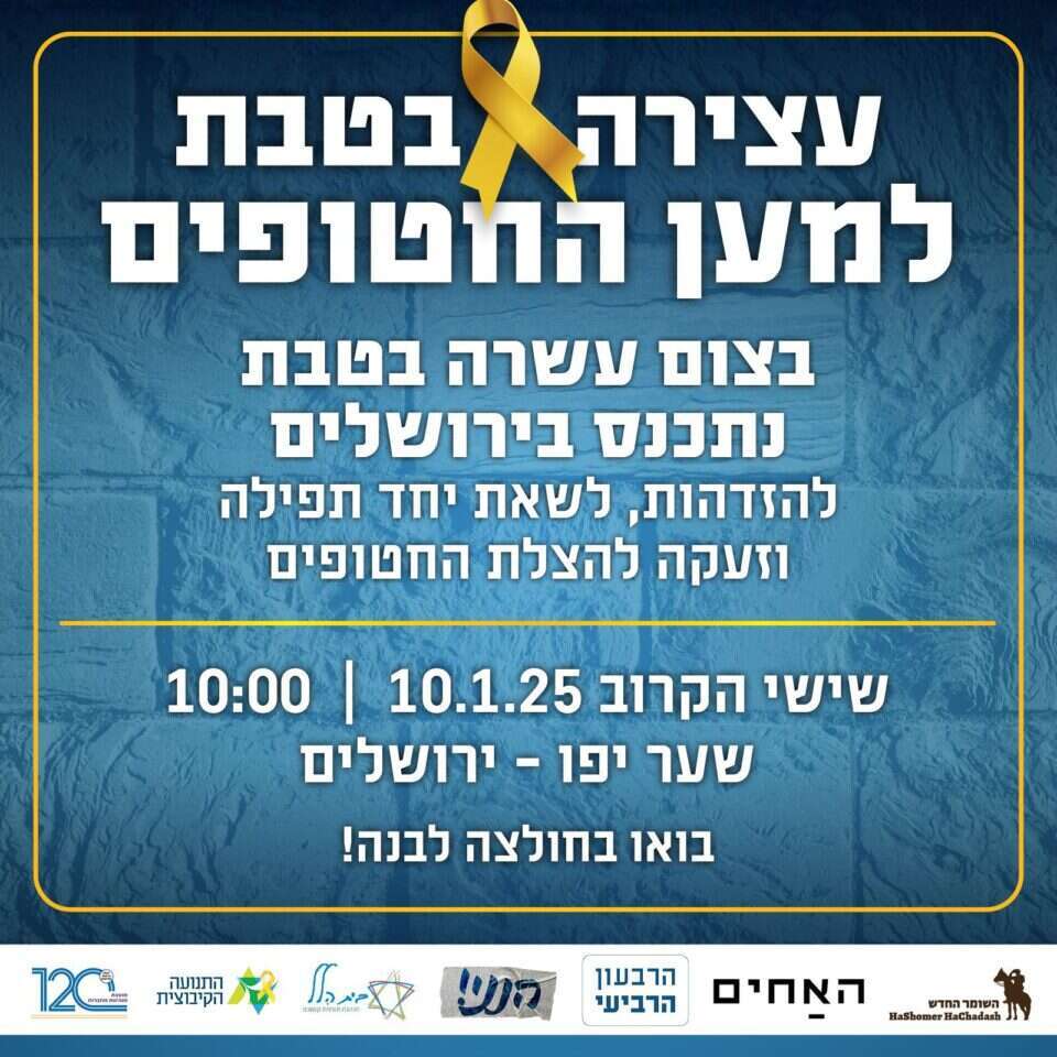 מחר (ו') יום צום עשרה בטבת, המסמל את היום בו הוטל המצור על ירושלים ותחילת חורבן הבית, תתקיים עצרת אחדות המונית שמטרתה לשאת תפילה משותפת לשיבתם של החטופים, וחיבור בין המחנות הפוליטיים שהופרדו בעקבות המחלוקת סביב סוגיית שחרור החטופים, ונותרו כל צד בכאבו. האירוע יתקיים בשעה 10:00 בבוקר, סמוך לחומות העיר העתיקה ובמהלכו יעלו לנאום פעילים ואנשי ציבור מצדדים ופלגים שונים. לצד ארגון בית הלל בין נותני החסות לאירוע נמצאים גם ארגון הרבעון הרביעי, השומר החדש התנועה הקיבוצית וארגונים נוספים.