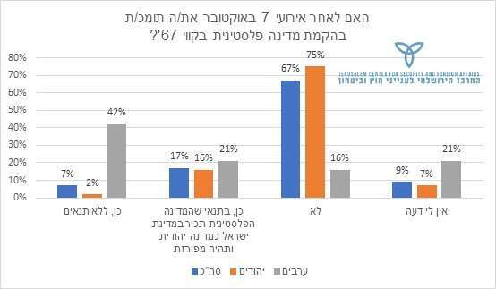 ממצאי הסקר מעלים כי 67 אחוזים מהציבור הישראלי מתנגדים להקמת מדינה פלסטינית בקווי 1967, זאת לאחר אירועי ה-7 באוקטובר. בעוד שבקרב המשיבים היהודים ההתנגדות גבוהה יותר (75 אחוזים), 42 אחוזים מהמשיבים הערבים תומכים בהקמת מדינה פלסטינית ללא תנאים (עלייה של 10 אחוזים מהסקר הקודם). בדומה לסקרים קודמים שביצע המרכז הירושלמי לענייני חוץ וביטחון, עולה מהממצאים כי ההתנגדות להקמת מדינה פלסטינית נמשכת גם אם התמורה לכך היא נורמליזציה עם סעודיה – התנגדות שעומדת באופן קבוע על מעל 60 אחוזים.