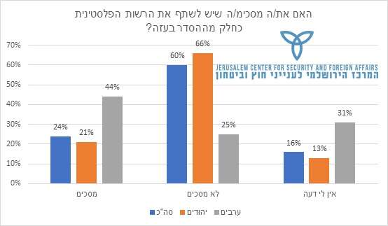 לפי הנתונים, 60 אחוזים מהישראלים מתנגדים גם לשילוב הרשות הפלסטינית בהסדר העתידי בעזה, כאשר בקרב הציבור היהודי ההתנגדות גבוהה במיוחד (66 אחוזים). מנגד, הציבור הערבי חלוק בדעותיו – 44 אחוזים תומכים בשיתוף הרשות הפלסטינית, 25 אחוזים מתנגדים, ו-31 אחוזים לא הביעו דעה בנושא.