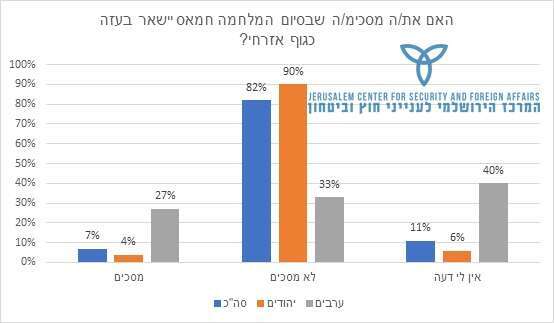רוב מוחלט של משתתפי הסקר (82 אחוזים) מתנגדים לכך שחמאס יישאר בעזה כגוף אזרחי - כמעט כל הציבור היהודי מתנגד לכך (90 אחוזים), לעומת 33 אחוזים שמתנגדים בקרב הערבים בישראל. התנגדות חזקה אף יותר (88 אחוזים) נרשמה בקרב הישראלים לרעיון שבסיום המלחמה חמאס יישאר כגוף צבאי שולט: 94 אחוזים מהמשיבים היהודים התנגדו לכך, לעומת התנגדות נמוכה יותר אצל המשיבים הערבים (46 אחוזים).