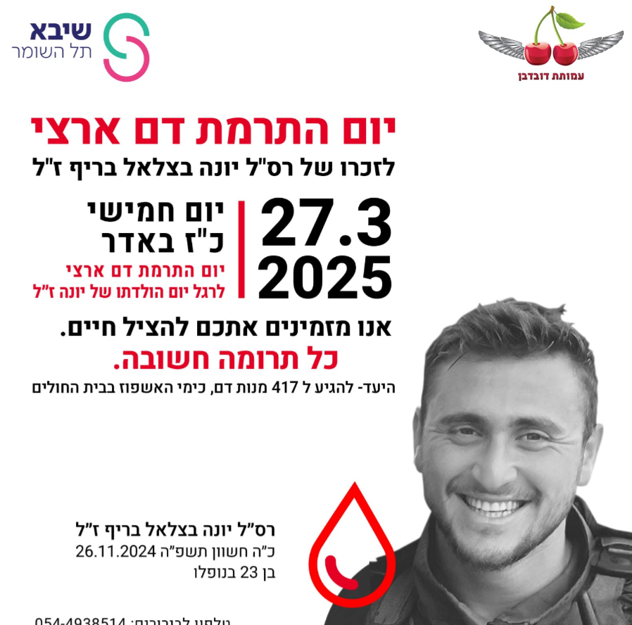 בדיוק לפני חמישה חודשים, הלך לעולמו רס"ל יונה בצלאל בריף, הפצוע הקשה ביותר ממלחמת חרבות ברזל, ששבר לא מעט שיאים במהלך 14 חודשים בהם היה מאושפז במחלקת טיפול נמרץ של תל השומר, והפגין חוזק וחוסן מעל לכל דמיון. השבוע, לכבוד יום הולדתו ה 24, משפחתו וחבריו פותחים ביוזמה מרגשת, בשיתוף מגן דוד אדום, עמותת דובדבן ובית החולים שיבא תל השומר, במסגרתה ייערך יום התרמת דם ארצי בכל רחבי הארץ.