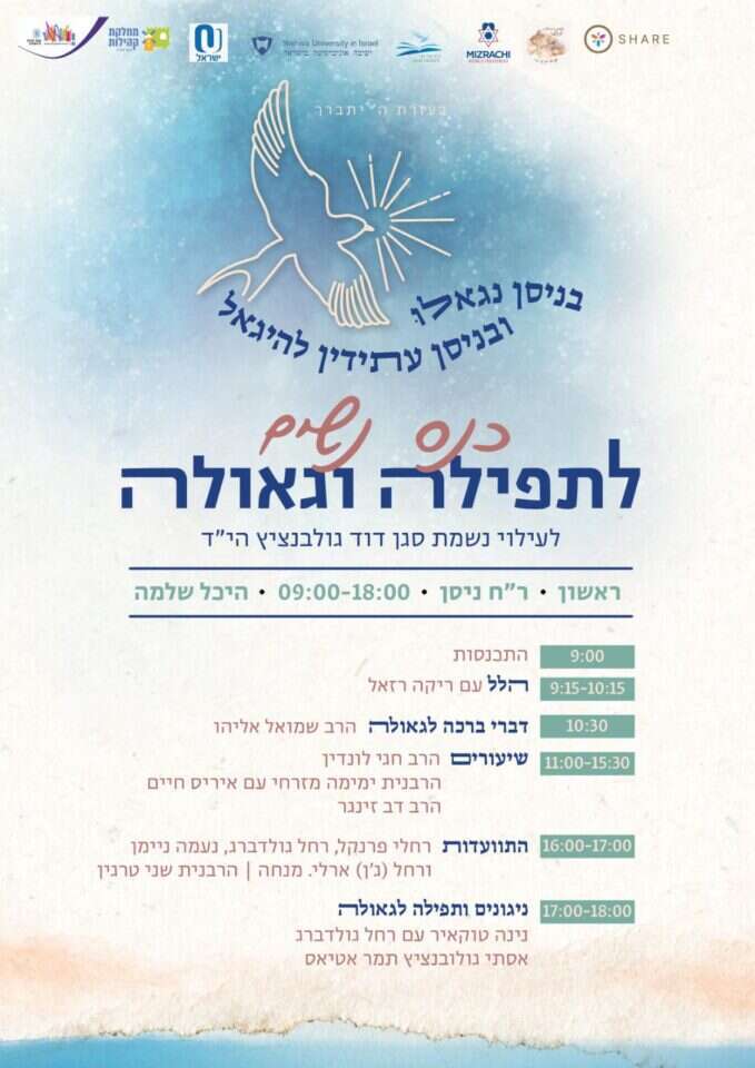 ביום ראשון הקרוב תיערך תפילת ראש חודש ניסן חגיגית ויום לימוד בהיכל שלמה בירושלים בשעה 9:00. האירוע מתקיים לזכרו של הלוחם, סגן דוד גולבנציץ, שנפל לפני כ־8 שנים במהלך פעילות מבצעית בחברון והיה מפקד הנערץ על פקודיו. התפילה תתקיים בהובלת ריקה רזאל ובהמשך יתקיימו שיעורים של הרב חגי לונדין, הרבנית ימימה מזרחי איריס חיים, הרב דב זינגר; התוועדות עם רחלי פרנקל, רחל גולדברג, נעמה ניימן ורחל ג'ו ארלי; ניגונים עם נינה טוקאיר, רחל גולדברג, אסתי גולובנציץ ותמר אטיאס.