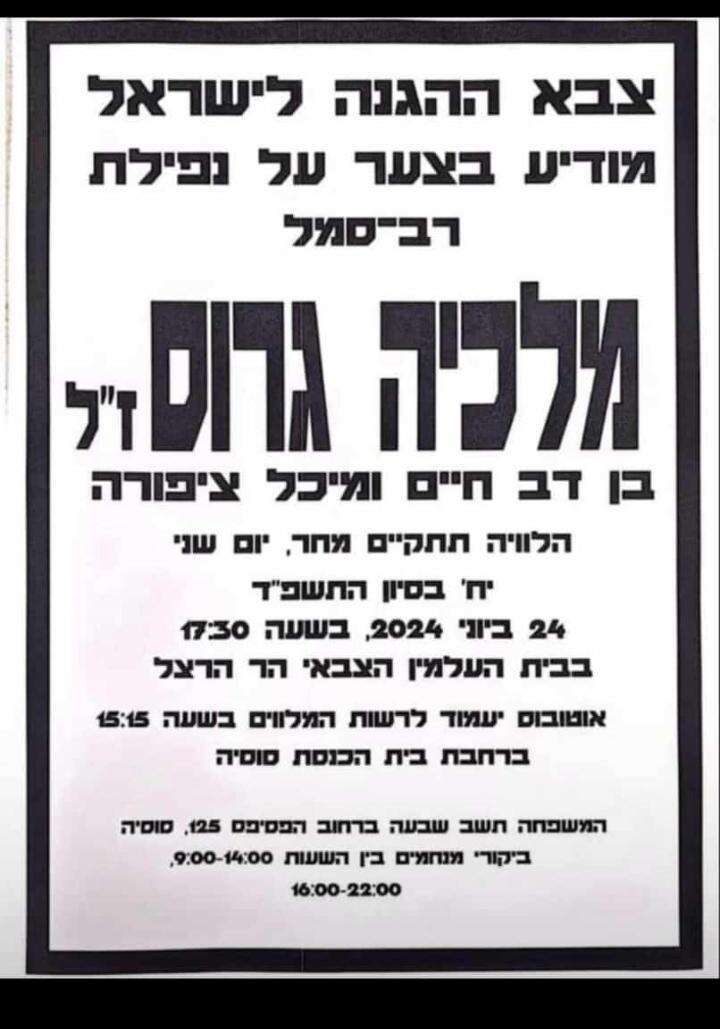 אמש (שבת) הותר לפרסום כי ברפיח נפל מלכיה גרוס, בן 25 מסוסיא, לוחם בגדוד השריון 9212, חטיבת 'אגרוף הברזל' (205).