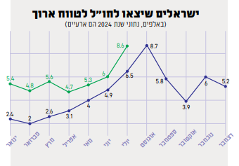 נתחיל בשאלה פשוטה: מתי האנשים האלה עזבו את ישראל? בלמ"ס הוסיפו להודעה גם גרף של מאזן ההגירה לפי חודשים. מספיק להסתכל בו שני רגעים כדי להבחין בקריסה הדרמטית של הנתונים בחודש אוקטובר 2024, בדיוק שנה לאחר פרוץ המלחמה. דמיינו משיכת חבל שבצידו האחד כל הישראלים שירדו מהארץ, ובצידו השני כל התושבים החוזרים. באותו חודש ארור ירדו מהארץ כל כך הרבה ישראלים, שהחבל נמשך עד מינוס 10,926. לשם השוואה, בתשעת החודשים של המאבק על הרפורמה, המאזן עמד על ממוצע של מינוס 969. במילים פשוטות, המלחמה גרמה לאפקט של יותר מפי עשרה בירידה מהארץ.