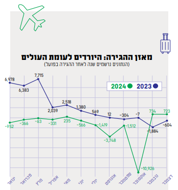 האם זה אומר שאין שום בעיה של ירידה מהארץ בעקבות הרפורמה המשפטית? לא, ודאי שלא, ובטח שאי אפשר לקבוע את זה מהנתונים שבידינו. אדרבה, מנתונים שפרסמה למ"ס עולה שבמהלך המחצית הראשונה של 2023, ימי שיא המאבק, אכן היה זינוק של עשרות אחוזים בנתוני הירידה מהארץ. בחודש ינואר 2023 הוצגה הרפורמה לראשונה, ובאותו חודש עזבו את הארץ לטווח ארוך 5,400 ישראלים, לעומת 2,400 בינואר בשנה הקודמת. וכך בכל חודש עד יולי, שנת 2023 הבריחה מכאן יותר אנשים מאשר בחודשים המקבילים אשתקד.