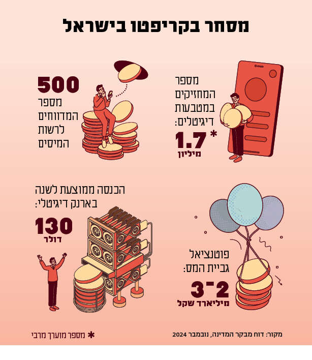 דו"ח שפרסם מבקר המדינה בחודש נובמבר האחרון על מיסוי מטבעות דיגיטליים, מעריך את פוטנציאל גביית המיסים בישראל מהכנסות מפעילות בקריפטו ב־2 עד 3 מיליארד שקל. על פי הדו"ח, בשנים 2018־2022 המספר השנתי הממוצע של המדווחים לרשות המיסים על פעילות בקריפטו היה 500 בלבד. "שיעור המדווחים לרשות המיסים על פעילות בקריפטו אפסי לעומת פוטנציאל הדיווח, שעל פי ההערכות הוא לכל הפחות 200,000 משתמשים", כתב המבקר. אגב, יש הערכות שמדברות על פוטנציאל גבייה שמתקרב גם ל־10 מיליארד שקל.