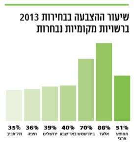 שיעור המצביעים בבחירות המקומיות הקודמות, לפני חמש שנים, עמד על 51 אחוזים בלבד. אבל גם הנתון הנמוך הזה עושה חסד למספרים האמיתיים. כפי שהראו אז במכון הישראלי לדמוקרטיה, היישובים הקטנים הטו מאוד את הממוצע כלפי מעלה. ביישובים הגדולים, שבהם יותר מ־50 אלף בעלי זכות הצבעה, עמד שיעור ההשתתפות הממוצע על 47%, בעוד שברשויות קטנות, עם פחות מ־5,000 בעלי זכות הצבעה, שיעור הבחירה הממוצע עמד על 71%. בתל־אביב הגיעו להצביע בבחירות 2013 רק 35% מתושבי העיר, בירושלים 39% מהתושבים, ובחיפה טרחו להגיע לקלפי רק 36% מתושבי העיר. חולדאי (עם 58% מקולות הבוחרים בתל־אביב), ברקת (51%) ויהב (49%) קיבלו אמנם הרבה יותר קולות ממתחריהם, אבל בסופו של דבר רק אחד מכל חמישה תושבים טרח לבוא ולתת להם את קולו.