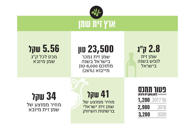 הישראלים אכן אוהבים את האוכל שלהם מתובל בשמן: בממוצע אנחנו צורכים כיום 2.8 ק"ג שמן זית לנפש בשנה - 50 אחוזים יותר מהכמות שצרכנו רק לפני 15 שנה. עם זאת, רק 14% מבקבוקי שמן הזית שנמכרים כיום ברשתות השיווק כאן מופקים מזיתים "ישראליים טהורים". לפי נתוני חברת המידע 'סטורנקסט', 797 אלפי ליטרים מבוקבקים נמכרו בשנה האחרונה מתוצרת ישראלית, בעוד ש־1.86 מיליון ליטרים הגיעו מחו"ל. 3 מיליוני ליטרים נוספים הוכנו מתערובת ישראלית ומיובאת, שלפחות גורמת לנו להרגיש טוב עם עצמנו ולהאמין שאנחנו מתבלים את הסלט שלנו בשמן סמי־ישראלי.