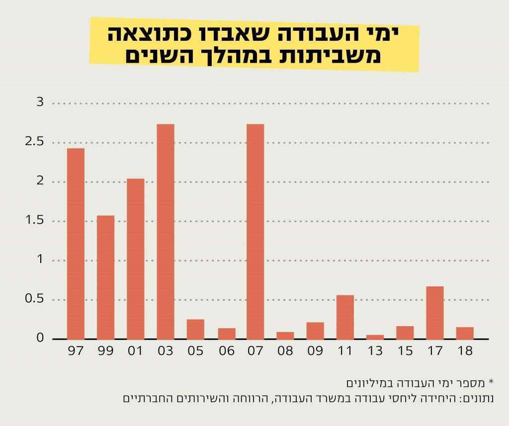 מי שחי פה בשנות התשעים ובראשית שנות האלפיים זוכר שלצד השלום שפרץ והאוטובוסים המתפוצצים, חווינו גם שביתות ענק במשק: מערכת החינוך שבתה חודשים ארוכים וכך גם האוניברסיטאות, ונמלי הים הושבתו לסירוגין במשך שנים נוכח הכוונה להכניס אליהם תחרות. שביתה כללית במשק הייתה מחזה נפוץ, וכל גורם היה עילה לשביתה כזו - מסגירת מפעל בנגב ועד תוכנית כלכלית לשיקום המשק. כה רבות היו השביתות, עד כי באמצע העשור הראשון של שנות האלפיים זכתה ישראל לתואר המפוקפק שיאנית השביתות העולמית, לאחר שבשנת 2003 רשמה שיא של 2.7 מיליון ימי עבודה אבודים בגינן.