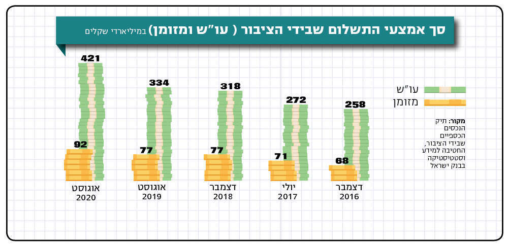 נכון לחודש אוגוסט, שוכב בחשבונות העו"ש של הציבור סכום מצטבר של 421 מיליארד שקל. זהו סכום שיא של כל הזמנים, והא מבטא זינוק של 26% תוך שנה. זהו גם הגידול החד ביותר שנרשם עד כה בתוך שנה (הגידול בתקופה המקבילה אשתקד עמד על כ־8% בלבד). אם נוסיף גם את המזומנים שבידי הציבור, שגם הם בשיא של כל הזמנים, נגיע לסכום של 513 מיליארד שקל. במצב של אי־ודאות וחשש לביטחון תעסוקתי, הציבור מעדיף להתבצר במזומן. וכשיש כסף נזיל, גובר הפיתוי לנסות את מזלנו ולחפש אפיקי השקעה "אטרקטיביים" שיניבו תשואה נאה.