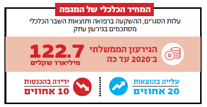 הגירעון הממשלתי זינק לרמה דו־ספרתית, כך דיווח ביום חמישי משרד האוצר בהערכה ראשונית של הוצאות הממשלה והכנסותיה ל־2020. ההוצאות הגבוהות כחלק מהתגובה הכלכלית למשבר הקורונה הביאו את הגירעון לסך חסר תקדים של 122.7 מיליארד שקלים. לשם הבנת קנה המידה: בסוף 2019 הסתכם החוב הציבורי של מדינת ישראל, כולל חובות הרשויות המקומיות, בסך 843 מיליארד שקלים; הגירעון הממשלתי השנה, לפיכך, יגדיל את הסכום הזה בכ־14 אחוזים.