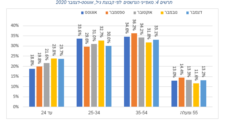 המשבר ממשיך לתת את אותותיו על הצעירים בשוק העבודה. הנרשמים כדורשי עבודה מקבוצת הגיל עד 24, עמדו בדצמבר על נתון כמעט זהה לנובמבר – 23.7 אחוז, לאחר עלייה עקבית בשיעור הנרשמים מקבוצה זו מאז אוגוסט. מנגד, שיעור החזרה לעבודה בקרב אותה קבוצה קפץ מ-18.3 אחוז בנובמבר ל-22.1 אחוז בדצמבר. נתונים אלה מלמדים על חוסר היציבות התעסוקתית של צעירים בשוק העבודה לנוכח הסגרים. בקבוצות הגיל הבוגרות 54-35, וכן בגילאי 55 ומעלה ניתן לראות עלייה בשיעור הנרשמים, מנתון של 43.4 אחוז לשתי הקבוצות יחד בנובמבר, ל-46.3 אחוז בדצמבר, וכן ירידה בשיעור החוזרים לעבודה בקבוצות אלה מ-52.3 אחוז בנובמבר ל-47.1 אחוז בדצמבר.