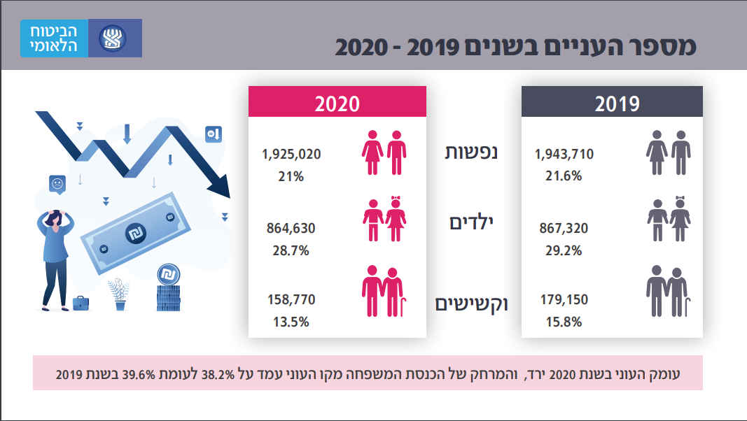 מספר הנפשות העניות בשנת 2020 עמד על 1.9 מיליון איש שהם כ-21 אחוז מהאוכלוסייה, שזו ירידה משנת 2019 אז כ-21.6 אחוז מהנפשות היו עניות. בקרב ילדי ישראל אף חלה ירידה כשבשנת 2020 היו כ-864 אלף משפחות עניות לעומת כ-867 אלף בשנת 2019. גם אצל הקשישים חלה ירידה משמעותית במיוחד כשבעוד בשנת 2019 היו כ-179 אלף אזרחים עניים שהיוו כ-16 אחוז ובשנת 2020 הנתון עמד על 158 אלף אזרחים ותיקים עניים שהם כ-13.5 אחוז מאוכלוסיית הקשישים.