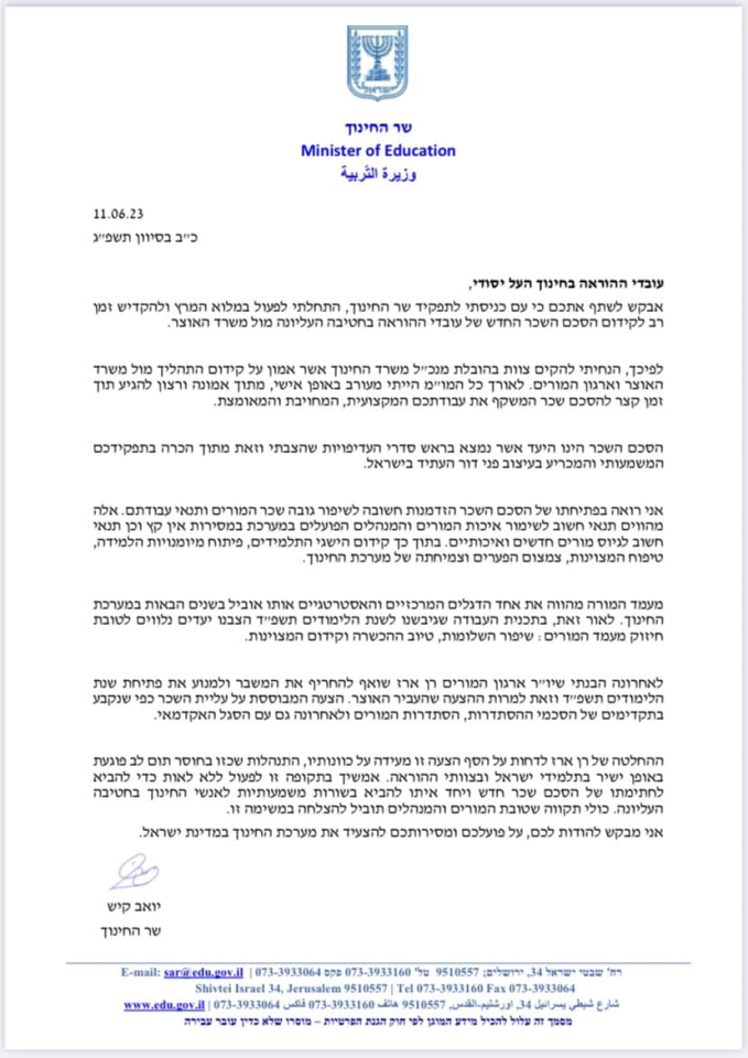 "אני רואה בפתיחתו של הסכם השכר הזדמנות חשובה לשיפור גובה שכר המורים ותנאי עבודתם. אלה מהווים תנאי חשוב לשימור איכות המורים והמנהלים הפועלים במערכת במסירות אין קץ וכן תנאי חשוב לגיוס מורים חדשים ואיכותיים. בתוך כך קידום הישגי התלמידים. פיתוח מיומנויות הלמידה, טיפוח המצוינות, צמצום הפערים וצמיחתה של מערכת החינוך", אמר שר החינוך והבהיר כי, "מעמד המורה מהווה את אחד הדגלים המרכזיים והאסטרטגיים אותו אוביל בשנים הבאות במערכת החינוך. לאור זאת, בתוכנית העבודה שגיבשנו לשנת הלימודים תשפ"ד הצבנו יעדים נלווים לטובת חיזוק מעמד המורים: שיפור השלומות, טיוב ההכשרה וקידום המצוינות".
