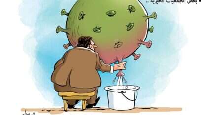 בקריקטורה רואים איש שבע יושב על כיסא ושואב חלב מעטיניו של נגיף הקורונה. הקריקטוריסט רומז לעמותות הצדקה, שמנצלות את המשבר ותופסות טרמפ על המצב בכדי להעשיר את עצמן.