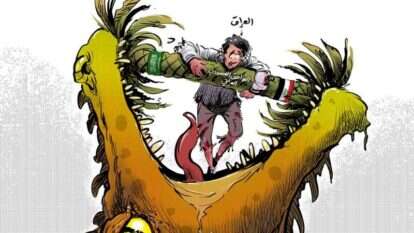 התנין מסמל את ההגמוניה האיראנית – אלהַיְמַנַה אלאִירַאנִיַה. הוא רוצה לטרוף את האזרח העיראקי, שרגליו זבות דם. העיראקי נאחז בכל כוחו בעץ הדקל שתקוע בין הלסתות של התנין.