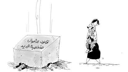 אבן ענקית קוברת תחתיה את הילדים האומללים. על האבן כתוב "קַאנוּן אלאַחְוַאל א-שַחְ'צִיַה אלגַ'דִיד" - חוק המצב האישי (חוק המשפחה) החדש. הקריקטוריסטית המצרייה דֻעַאא אלעַדְל יוצאת נגד החוק החדש שמשפיל, לדעתה, את האישה ופוגע אנושות בילדיה.