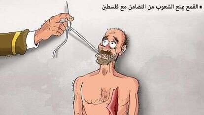 אך, הוא לא יכול לומר מילה, בשל דיכוי חופש הביטוי בארצו. הקריקטוריסט העזתי ד"ר עלא' א-לקטה מקונן על כך שהפלסטינים לא זוכים לתמיכת האומה הערבית והם נותרים בדד בזירה.