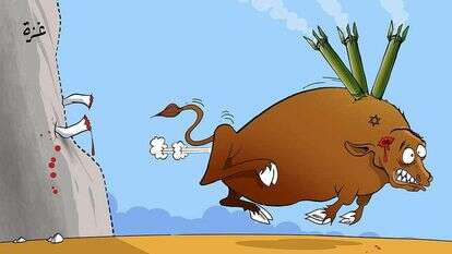 הוא מצייר את ישראל כשור פצוע שבורח מהזירה. השור מנסה לנגוח בעזה, אך, הוא מאבד את קרניו שננעצות בקיר, והוא נאלץ לסגת משדה הקרב בבהלה בהשפלה. בגבו תקועים טילים של חמאס. טילים שמזכירים את החניתות שננעצות בגבו של הפר במלחמות שוורים.