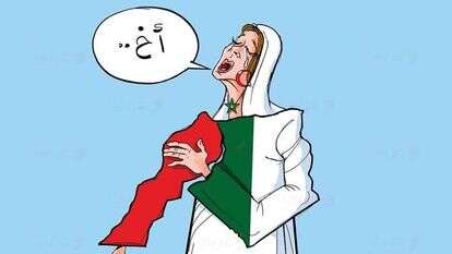 האישה הדומעת שבקריקטורה מסמלת את המפות של אלג'יריה – אלגַ'זַאאִ'ר – ומרוקו – אלמַעְ'רִבּ. היא מבכה את ניתוק היחסים בין שתי המדינות ואומרת – "אַח'".